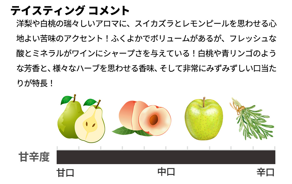 洋梨や白桃の瑞々しいアロマに、スイカズラとレモンピールを思わせる心地よい苦味のアクセント!ふくよかでボリュームがあるが、フレッシュな酸とミネラルがワインにシャープさを与えている!白桃や青リンゴのような芳香と、様々なハーブを思わせる香味、そして非常にみずみずしい口当たりが特長!