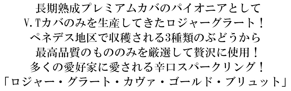 あの最高級ロゼ・シャンパンに勝った超噂のカヴァ・ロゼ(ロジャー・グラート)であまりに有名!長期熟成プレミアムカバのパイオニアとしてヴィンテージカバのみを生産してきたロジャーグラートの看板ゴールド・ブリュット!