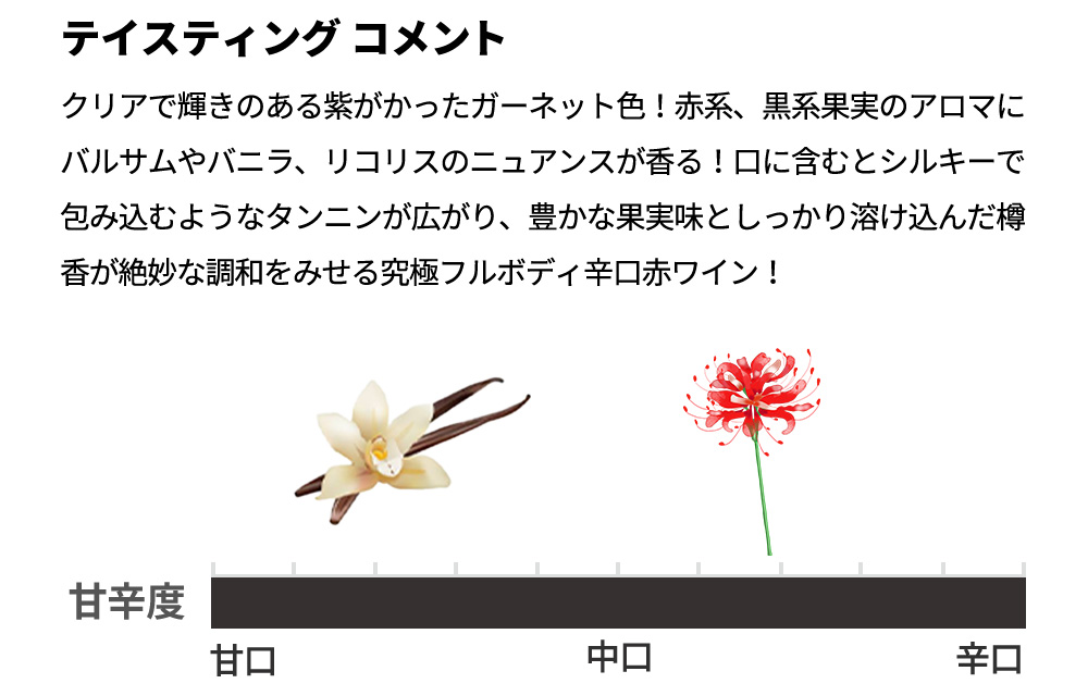 クリアで輝きのある紫がかったガーネット色!赤系、黒系果実のアロマにバルサムやバニラ、リコリスのニュアンスが香る!口に含むとシルキーで包み込むようなタンニンが広がり、豊かな果実味としっかり溶け込んだ樽香が絶妙な調和をみせる究極フルボディ辛口赤ワイン!究極フルボディ辛口赤ワインが限定で極少量入荷!