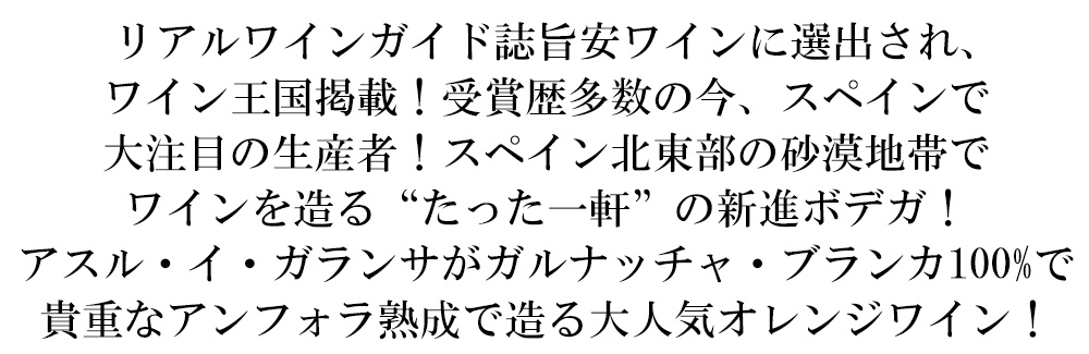 自然派・ビオロジックの樹齢30年以上のガルナッチャ・ブランカ種100%を5日間のスキンコンタクトの後、天然酵母にて小型ステンレスタンク醗酵!アンフォラ6ヶ月熟成で仕上げられたオレンジワイン(野生酵母のみ、アンフォラ熟成、清澄剤不使用、ノンフィルター)!