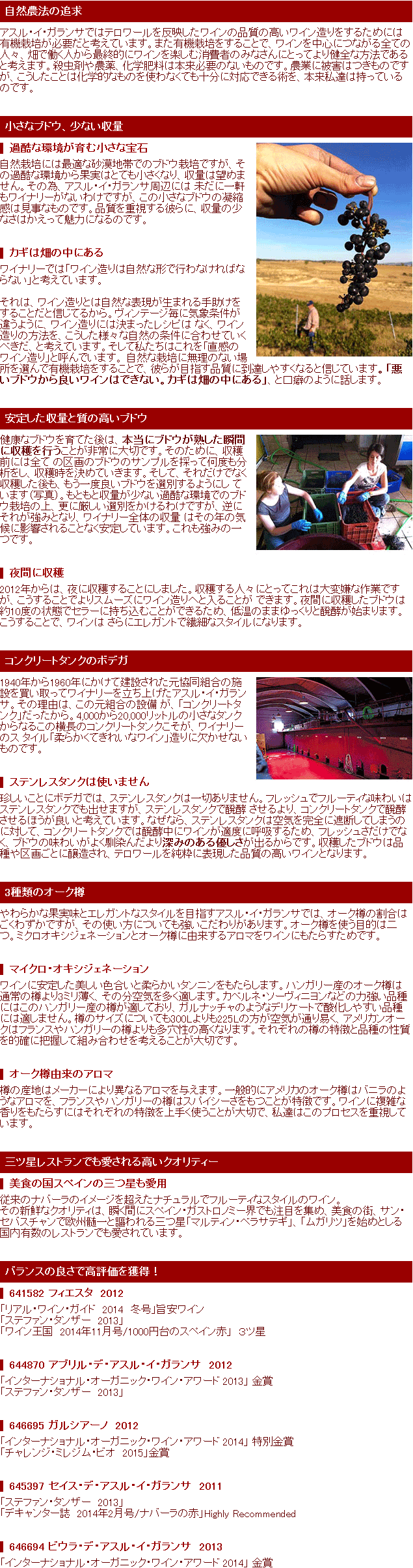 従来のナバーラのイメージを超えたナチュラルでフルーティなスタイルのワイン。その新鮮なクオリティは、瞬く間にスペイン・ガストロノミー界でも注目を集め、美食の街サン・セバスチャンで欧州随一と謳われる三ツ星「マルティン・ベラサテギ」、「ムガリツ」を始めとする国内有数のレストランでも愛されています。「ガランサ」は、輝きのある深い赤色を意味します。これに「アスル」(青色)が混ざると、フレッシュで凝縮感に溢れた果実の色、つまり彼らの赤ワインの色になります。ボデガにその想いを込めて名付けました。