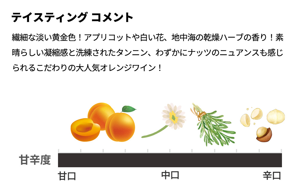 繊細な淡い黄金色!アプリコットや白い花、地中海の乾燥ハーブの香り!素晴らしい凝縮感と洗練されたタンニン、わずかにナッツのニュアンスも感じられるこだわりの大人気オレンジワイン遂に少量入荷!ナバーラの唯一無二の極上の味わいをぜひご堪能下さい!