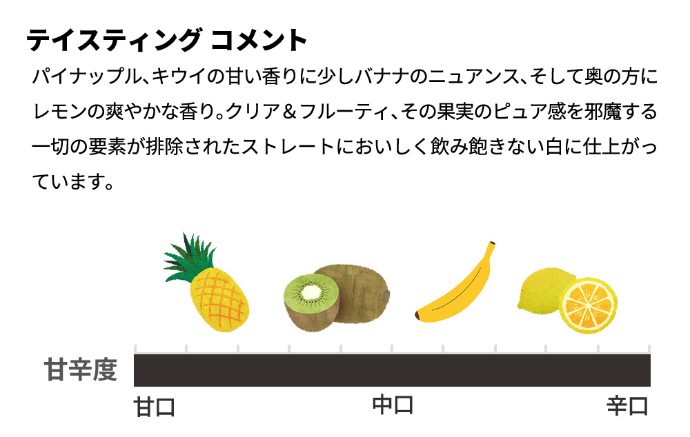 パイナップル、キウイの甘い香りに少しバナナのニュアンス、そして奥の方にレモンの爽やかな香り。クリア&フルーティ、その果実のピュア感を邪魔する一切の要素が排除されたストレートにおいしく飲み飽きない白に仕上がっています。