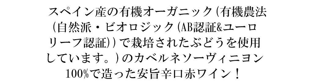 フランス ロワールの生産者がスペイン産の有機オーガニックのカベルネソーヴィニヨン100%で造った安旨辛口赤ワイン!