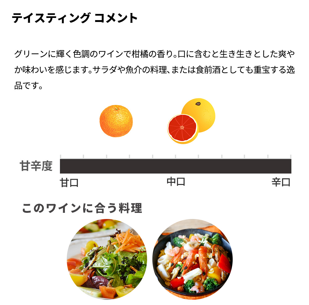 グリーンに輝く色調のワインで柑橘の香り。口に含むと生き生きとした爽やか味わいを感じます。サラダや魚介の料理、または食前酒としても重宝する逸品です。