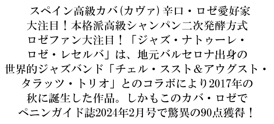 スペイン最高評価誌「ペニン・ガイド誌」でも高評価(なんとこのカバ・ジャズ・ナトゥーレ・ロゼでペニンガイド誌2024年2月号で驚異の90点獲得!絶賛コメントは『色:ラズベリー・ローズ アロマ:赤いベリーの香り、フローラル、香草、表情豊か、ラズベリー。風味:スパイシー、程よい酸味、繊細な苦味。色: ブリリアント・ローズ アロマ: 赤いベリーの香り、野生のハーブ、セロリ、ストーンフルーツ。風味: フレッシュ、フルーティ、程よい酸味、風味豊か。90点』と絶賛!!