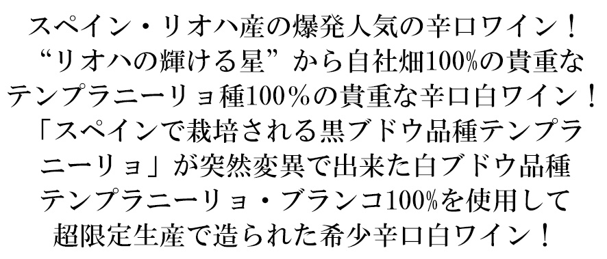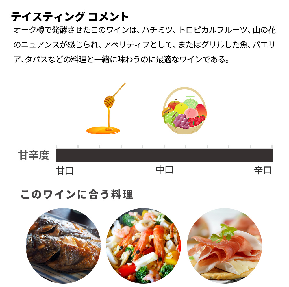 心地よい余韻を残し、フレッシュで余韻が長く、熟成能力の高さが際立つ白ワイン。日本では赤のリオハベガが人気ですがスペイン本国では断トツにこの辛口の白ワインがレストラン様や愛好家に人気だそうです。