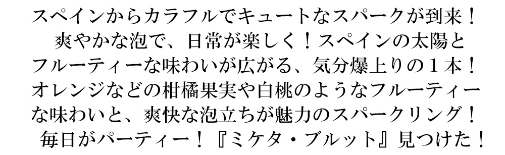 「ミケタ」見つけた!スペインからカラフルでキュートなスパークリング到来!お手頃価格で毎日がパーティー!爽やかな泡で、日常がポップに変わる!スペインの太陽とフルーティーな味わいが広がる、気分爆上がりの1本!その名も『ミケタ・ブルット』!