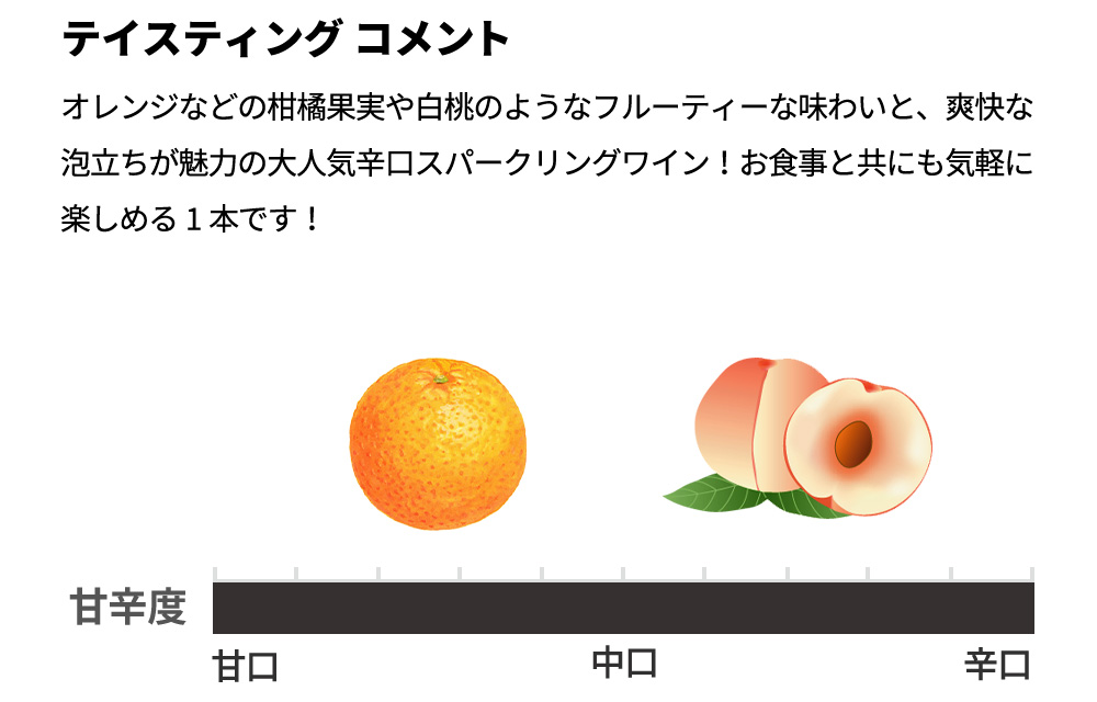 ガス圧3.5気圧の辛口スパークリングワイン!オレンジなどの柑橘果実や白桃のようなフルーティーな味わいと、爽快な泡立ちが魅力の大人気辛口スパークリングワイン!お食事と共にも気軽に楽しめる1本です!