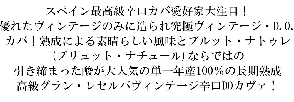 樹齢の高い葡萄を使い、優れたヴィンテージのみに造られる高級シャンパン方式(シャンパン二次発酵方式)の究極プレミアム・ヴィンテージ・D.O.カバ!