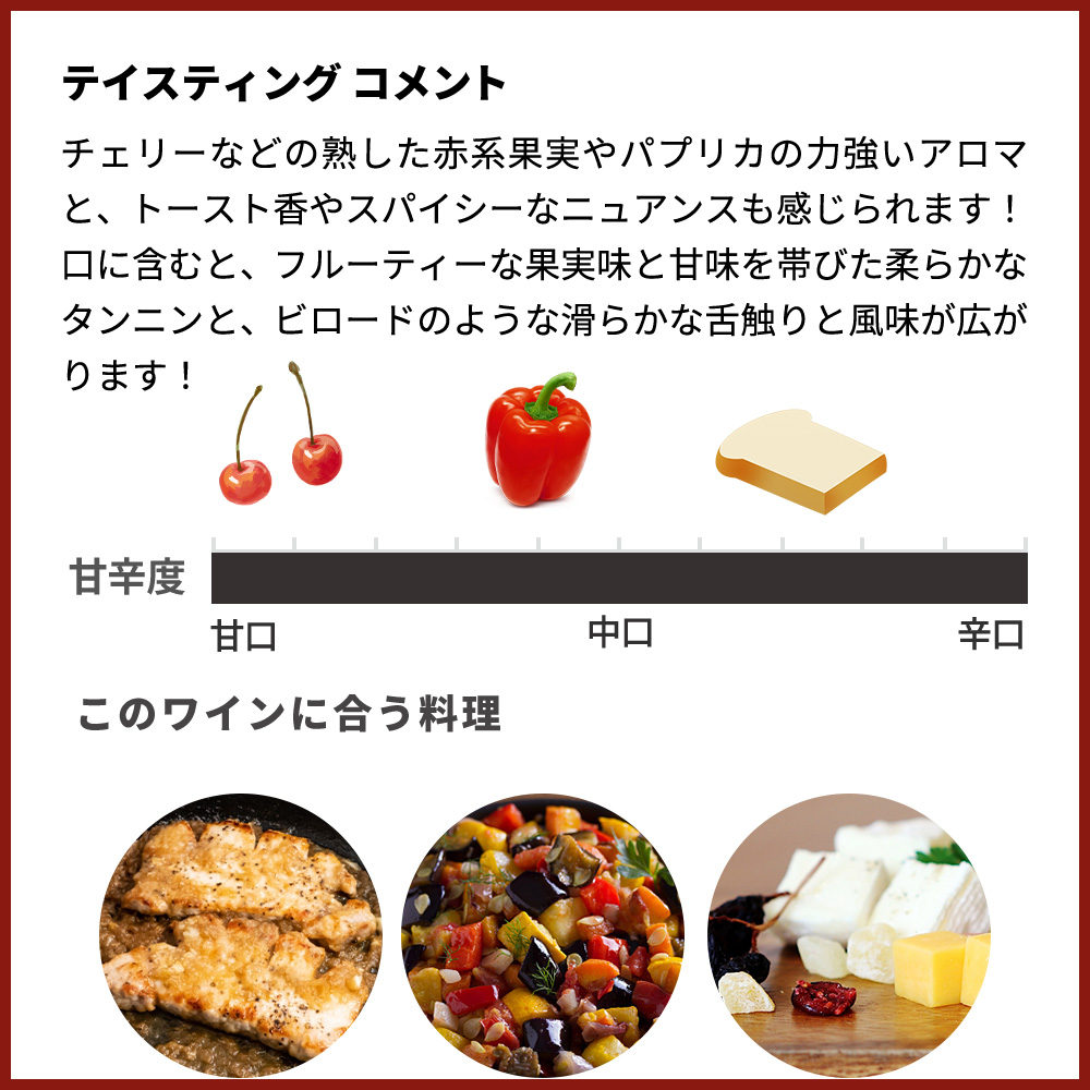 外観は紫がかったルビー色!チェリーなどの熟した赤系果実やパプリカの力強いアロマと、トースト香やスパイシーなニュアンスも感じられます!口に含むと、フルーティーな果実味と甘味を帯びた柔らかなタンニンと、ビロードのような滑らかな舌触りと風味が広がります!