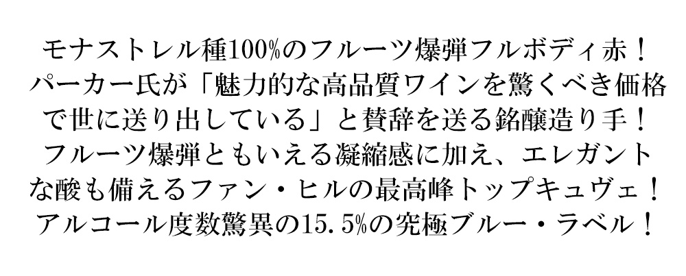 フレッシュで、バランスが良く、よりエレガントで余韻が長い。アルコール度数は15.5%。ドライな仕上がり。