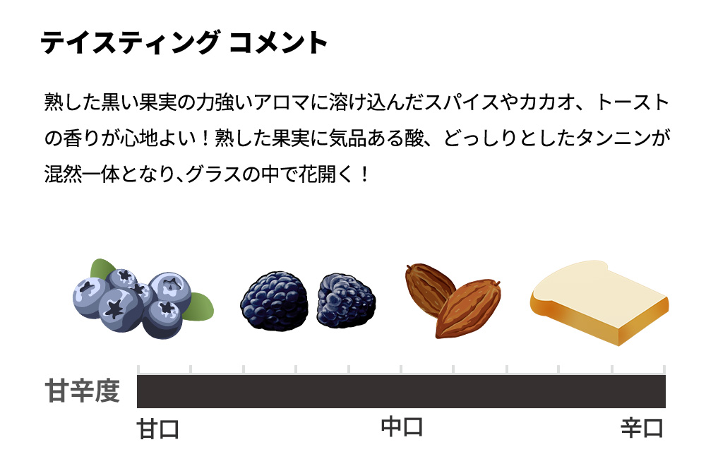 熟した黒い果実の力強いアロマに溶け込んだスパイスやカカオ、トーストの香りが心地よい!熟した果実に気品ある酸、どっしりとしたタンニンが混然一体となり、グラスの中で花開く!