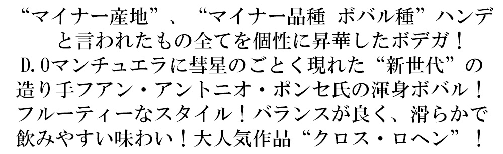 マンチュエラを愛しボバル種を知り尽くしたフアン・アントニオ・ポンセ氏だから完成した極上のフルーティーなスタイルのワイン!バランスが良く、滑らかで飲みやすい味わいが人気!自然派ビオロジックの大人気クロス・ロヘンが待望入荷!