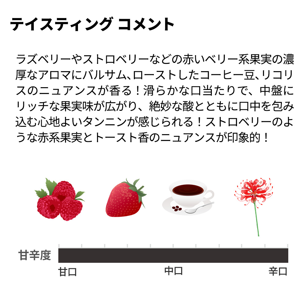 外観は、クリアで輝きのある紫がかった上品なチェリーレッド色!ラズベリーやストロベリーなどの赤いベリー系果実の濃厚なアロマにバルサム、ローストしたコーヒー豆、リコリスのニュアンスが香る!滑らかな口当たりで、中盤にリッチな果実味が広がり、絶妙な酸とともに口中を包み込む心地よいタンニンが感じられる!ストロベリーのような赤系果実とトースト香のニュアンスが印象的!