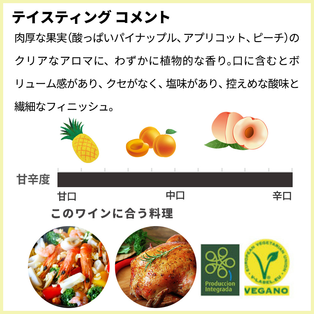 蔵元からのコメントは『緑がかった黄金色の輝きを持つ麦わら色。清潔でとても明るい。肉厚な果実(酸っぱいパイナップル、アプリコット、ピーチ)のクリアなアロマに、わずかに植物的な香り。口に含むとボリューム感があり、クセがなく、塩味があり、控えめな酸味と繊細なフィニッシュ。最初のアタックはまろやかで、品種の典型とその調和が際立つ。シーフード、魚、鶏肉、米、フレッシュチーズ。』と絶賛!