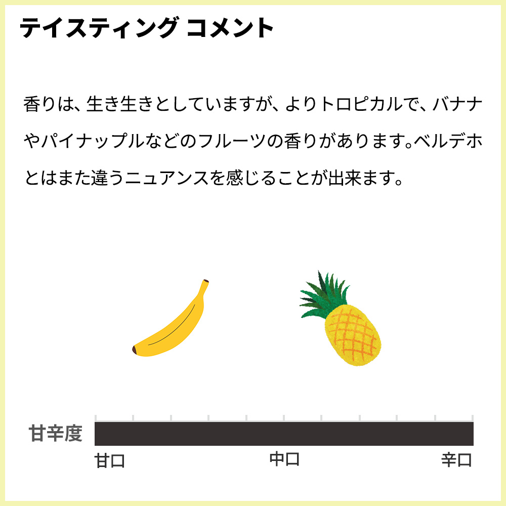 金色がかった淡い麦藁色。香りは、生き生きとしていますが、よりトロピカルで、バナナやパイナップルなどのフルーツの香りがあります。ベルデホとはまた違うニュアンスを感じることが出来ます。酸度は中位から高めですが、決してトゲトゲしておらず、バランスの良い味わいで何杯でも飲みたくなります。スムーズで、新鮮な味わい。