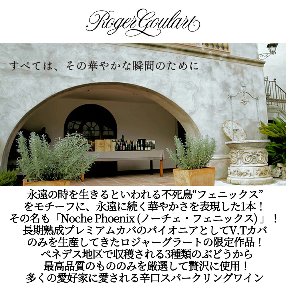 それぞれの品種の持ち味を生かし、心地よいフルーティさとやわらかな酸味が見事に調和!果実味と熟成感の絶妙なバランスで、飲みやすく、多くの人に愛される辛口スパークリングワイン!ロジャー・グラート・カヴァ・ブリュット・ノーチェ・フェニックスが待望入荷!