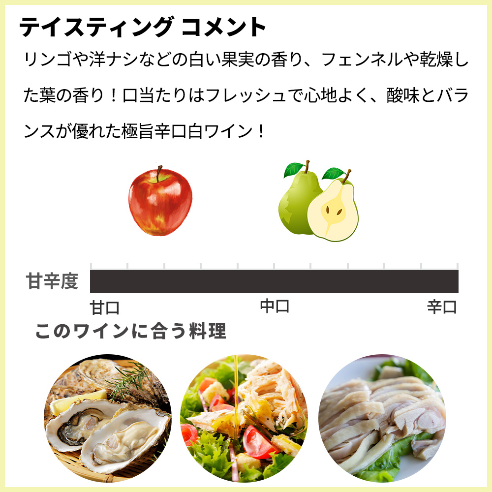 淡い緑色!リンゴや洋ナシなどの白い果実の香り、フェンネルや乾燥した葉の香り!口当たりはフレッシュで心地よく、酸味とバランスが優れた極旨辛口白ワイン!