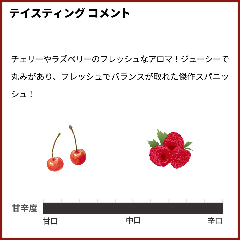 チェリーやラズベリーのフレッシュなアロマ!ジューシーで丸みがあり、フレッシュでバランスが取れた傑作スパニッシュ!もちろん正規品の素晴らしい状態で限定少量入荷!