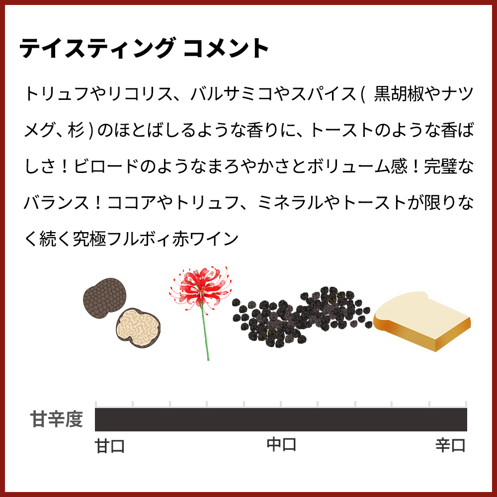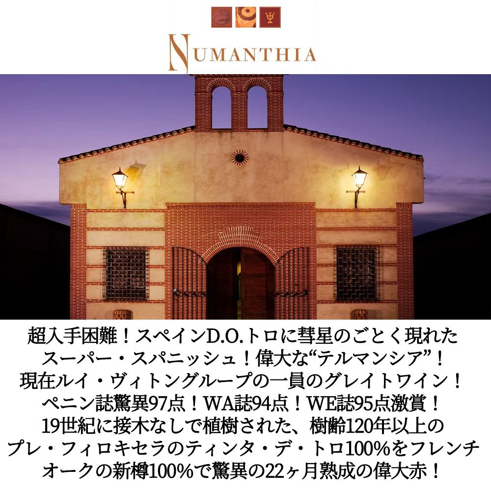 トリュフやリコリス、バルサミコやスパイス (黒胡椒やナツメグ、杉) のほとばしるような香りに、トーストのような香ばしさ!ビロードのようなまろやかさとボリューム感!完璧なバランス!ココアやトリュフ、ミネラルやトーストが限りなく続く究極フルボィ赤ワイン“テルマンシア”が13年熟成の現行ヴィンテージ[2012]年で限定で極少量入荷!