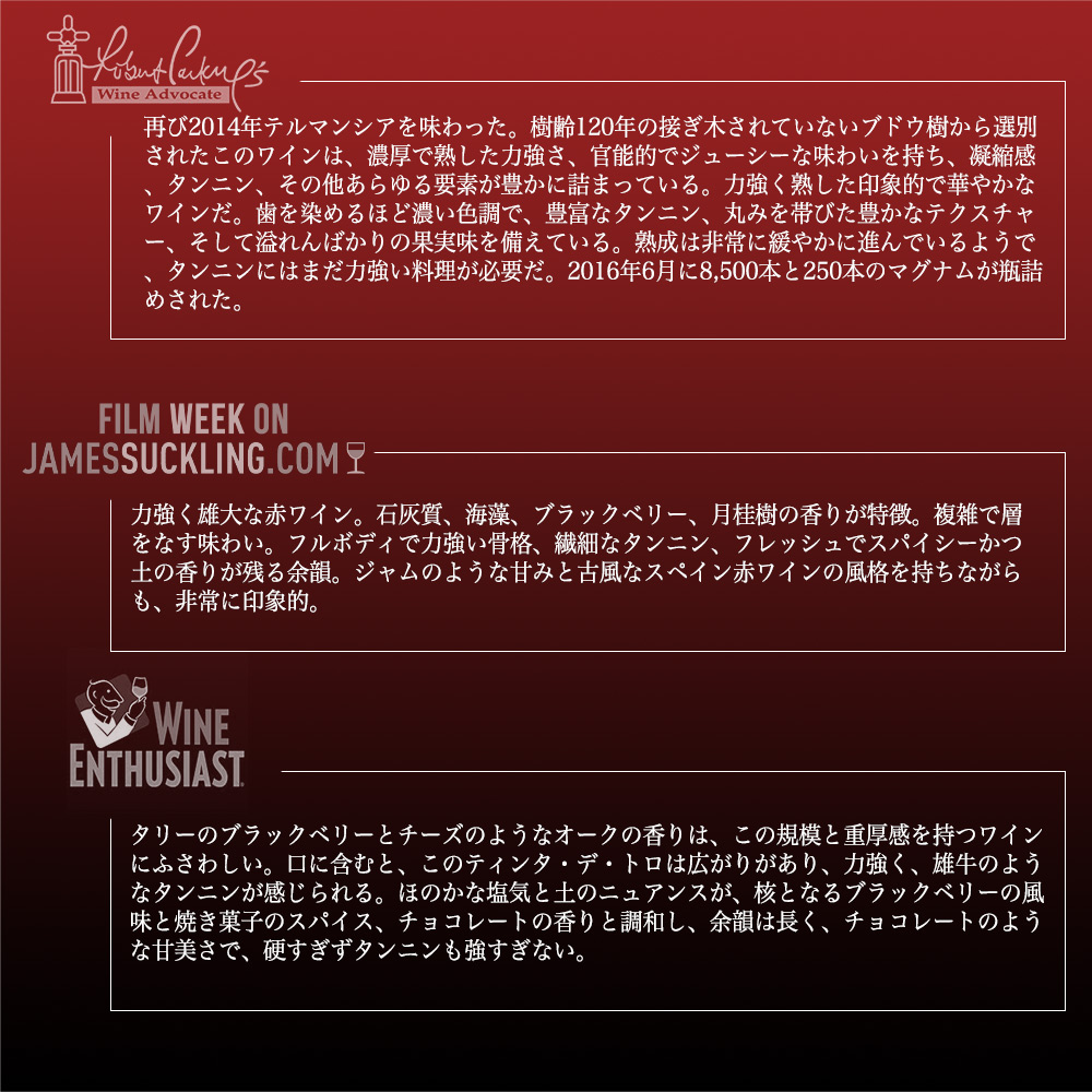 スペインD.O.トロに彗星のごとく現れた2004年のテルマンシアで、いきなりパーカーポイント100点満点獲得!スペイン権威評価誌ペニン・ガイド誌でも大注目!