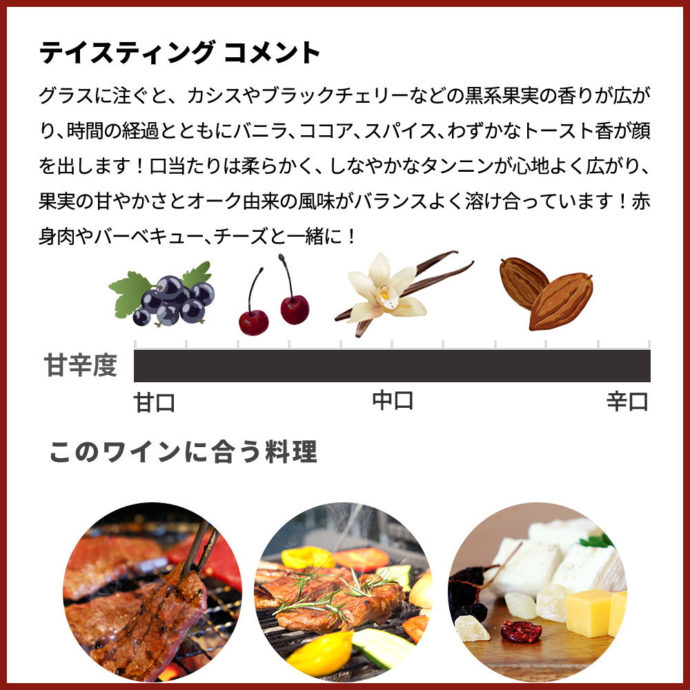 果実味と熟成香が見事に調和した一本です!色合いは深みのあるルビー色!グラスに注ぐと、カシスやブラックチェリーなどの黒系果実の香りが広がり、時間の経過とともにバニラ、ココア、スパイス、わずかなトースト香が顔を出します!口当たりは柔らかく、しなやかなタンニンが心地よく広がり、果実の甘やかさとオーク由来の風味がバランスよく溶け合っています!中程度のボディながらも奥行きがあり、口中に残る余韻は長く、樽熟成による滑らかさが印象的です!若いうちはフレッシュな果実味を、熟成が進むとより複雑で丸みのある味わいを楽しめます!赤身肉やバーベキュー、チーズと一緒に!