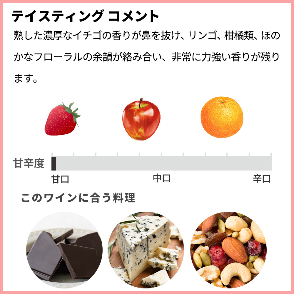 甘く、そして非常にエレガントな味わいを生み出し、長い余韻が続きます。ダークチョコレートやチョコケーキ、ブルーチーズや熟成チーズ、ドライフルーツやナッツ類と合わせていただくのがおすすめです。