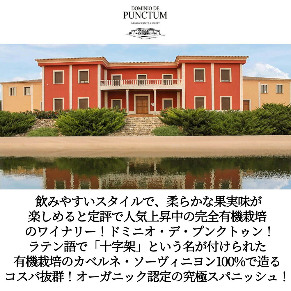 ワイナリー名になっているプンクトゥンは、ラテン語で十字路の意味!彼らのフィロソフィーは「地域の個性とコストパフォーマンスを備えたワインを、ビオディナミ農法によって消費者に届けること」!スペインだから出来る有機栽培ブドウ100%使った非常にリーズナブルなカベルネ・ソーヴィニヨン!