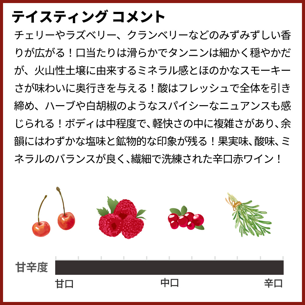 リスタン・ネグロ種由来の繊細な赤系果実の風味が感じられ、チェリーやラズベリー、クランベリーなどのみずみずしい香りが広がる!口当たりは滑らかでタンニンは細かく穏やかだが、火山性土壌に由来するミネラル感とほのかなスモーキーさが味わいに奥行きを与える!酸はフレッシュで全体を引き締め、ハーブや白胡椒のようなスパイシーなニュアンスも感じられる!ボディは中程度で、軽快さの中に複雑さがあり、余韻にはわずかな塩味と鉱物的な印象が残る!果実味、酸味、ミネラルのバランスが良く、繊細で洗練された辛口赤ワイン!