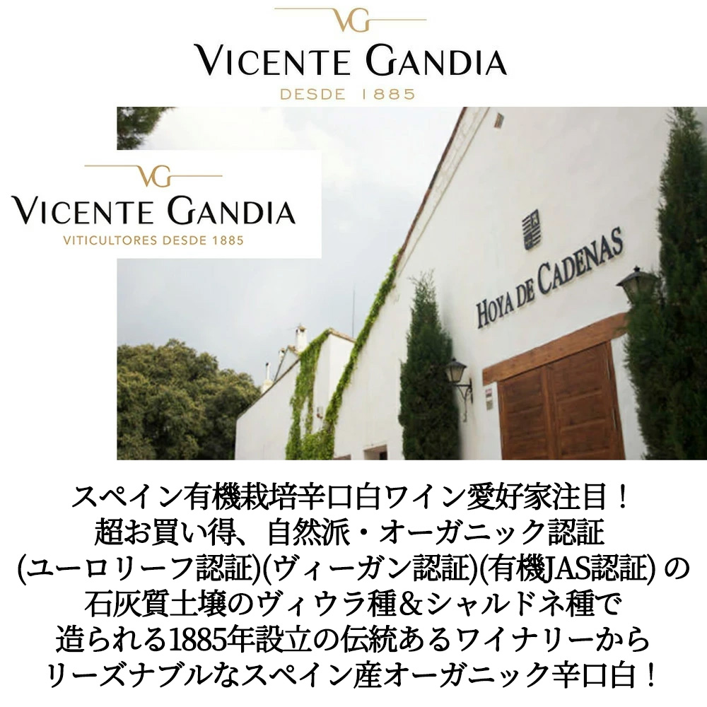 超お買い得、自然派・オーガニック認証 (ユーロリーフ認証) (ヴィーガン認証) (有機JAS認証) の石灰質土壌のヴィウラ種&シャルドネ種で造られる伝統あるワイナリーのリーズナブルなスペイン産オーガニック辛口白!
