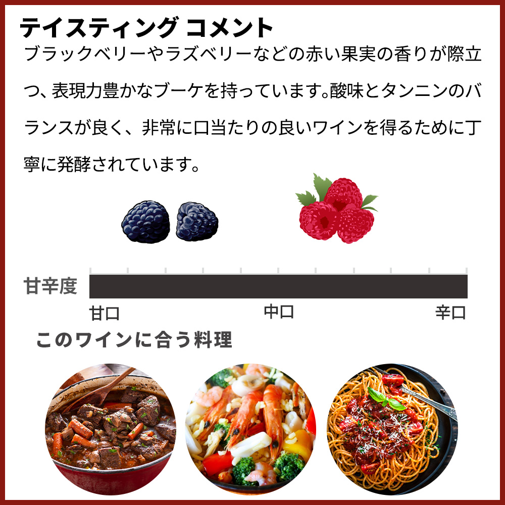 (チェリーレッドの色合いが特徴です。黒プラムの濃厚な香りにライラックやバニラのニュアンスが感じられます。口当たりはしっかりとしており、長く続く余韻にはエレガントでトーストした香りが残ります。シチュー、お米料理、パスタによく合います。適温17-18度、ミディアム-フルボディ)