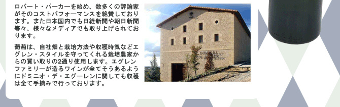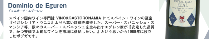 スペイン国内ワイン専門誌 VINO&GASTORONAMIA にてスペイン・ワインの至宝『ベガシシリア・ウニコ』よりも高い評価を獲得したスーパー・スパニッシュ ヌマンシア等数々のスーパー・スパニッシュを生み出すエグレン家が『安定した品質で、かつ安価で上質なワインを市場に供給したい。』という思いから1988年に設立したボデガです。