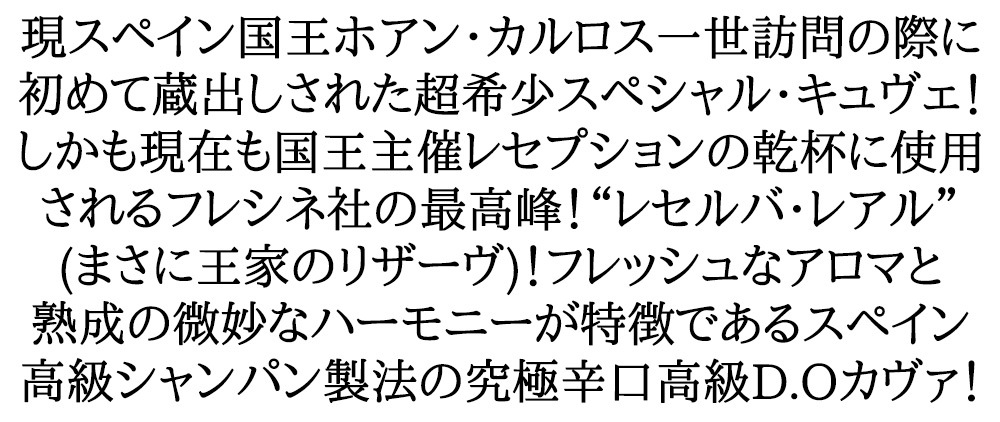 【豪華箱付】フレシネ レゼルバ レアル キュヴェ ド プレステージ カバ ブリュット 数量超限定輸入品 D.Oカヴァ ■ぶどう品種:バレリャダ種/マカベオ種/チャレロ種 ■ドサージュ:4g ■発酵・熟成:瓶内30ヶ月熟成 高級シャンパーニュ愛好家大注目!希少!最高級スペイン・カバ!スペイン王室御用達カバ! しかも現スペイン国王ホアン・カルロス一世訪問の際に初めて蔵出しされた超希少スペシャル・キュヴェ!しかも現在も国王主催レセプションの乾杯に使われるフレシネ社の最高級品! その名も“レセルバ・レアル”(王家のリザーヴ)!クリの木樽で熟成した門出のリキュールが味わいにアクセントを添えるフレッシュなアロマと熟成の微妙なハーモニーが特徴! しかも動瓶(ルミアージュ)も1本1本熟練した専門の職人によって手作業で行い、澱抜きもすべて手作業で行われます!落ち着いた麦わら色!イースティな熟成香にレゼルバ・ワインのふくよかな香り! 生き生きとした酸味とビスケットのような香ばしい風味に絡まるワインのコクのある味わい!の究極高級辛口カヴァが超限定で少量入荷!