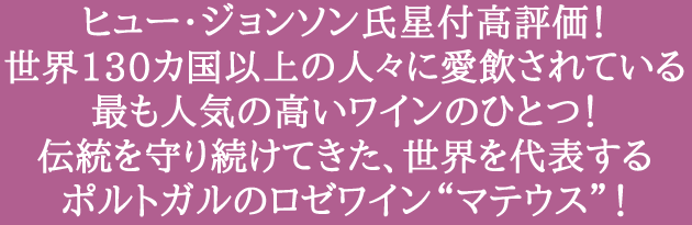 マテウス・ロゼについてヒュージョンソン氏は星付で「世界中で一番売れている、炭酸ガス吹込み法による弱発泡性の本辛口のロゼの銘柄!ソグラペ社がバイッラーダで生産!現在は南フランス(シラーズでつくるもの)とスペイン(テンプラニーリョでつくるもの)でも生産している。」