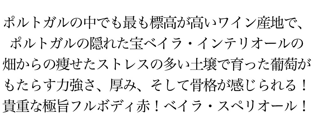 ベイラ・スペリオール・ティント[2019]年・ベイラ ■葡萄品種:ティンタ・ロリス種(テンプラニーリョ)80%/ジャエン(メンシア)種10%/トウリガ ナショナル種10% ■土壌:シスト ■樹齢:40年以上 ■収穫:手摘み ■熟成:8ヶ月 ■発酵:コンクリートタンクで7日間 ポルトガルの中でも最も標高が高いワイン産地でありポルトガルの隠れた宝、ベイラ・インテリオールの畑からの痩せたストレスの多い土壌で育った葡萄がもたらす力強さ、厚み、そして骨格が感じられる貴重フルボディ辛口赤ワイン! ポルトガルの中でも最も標高が高いワイン産地でありポルトガルの隠れた宝、ベイラ・インテリオールの畑からの痩せたストレスの多い土壌で育った葡萄がもたらす力強さ、厚み、そして骨格が感じられる貴重フルボディ辛口赤ワイン! 口に含むと、痩せたストレスの多い土壌で育った葡萄がもたらす力強さ、厚み、そして骨格が感じられるポルトガル・フルボディ辛口赤ワインが限定で少量入荷!