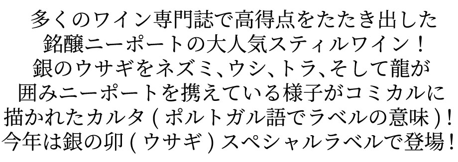 ニーポート エト カルタ ブランコ 銀の卯 シルバー ラビット 2021 限定輸入品 兎年ラベル ニーポート社 DOCドウロ ポルトガル ■ぶどう品種:ゴデガ/ラビガト/ゴウヴェイオ/他 ■発酵・熟成:発酵はステンレスタンク75%、フレンチオーク樽25%でそれぞれ熟成 ■樹齢:20~50年の多くの品種が混植 2023年の干支ラベル(銀のウサギ(兎)ラベル)が今年もついに発売(金・銀ラベルともに発売)! ワインスペクテーター誌大注目!ワインアドヴォケイト誌大注目!(バトゥータでパーカーポイント3年連続92点以上の高評価)ジャンシス・ロビンソン大絶賛!多くのワイン専門誌で高得点をたたき出したニーポートのスティルワイン! 今年はこのエト・カルタが来るべき2023年の“卯年(ウどし)”に向け、銀の兎(ウサギ)のスペシャルラベルで登場! レモン、桃、白い花のような爽やかな香り。心地よい酸味、ミネラル感がうまくマッチし、とてもバランスよく仕上がった究極辛口白ワインが限定で少量入荷! 卯年の方へのプレゼントにも最適です!