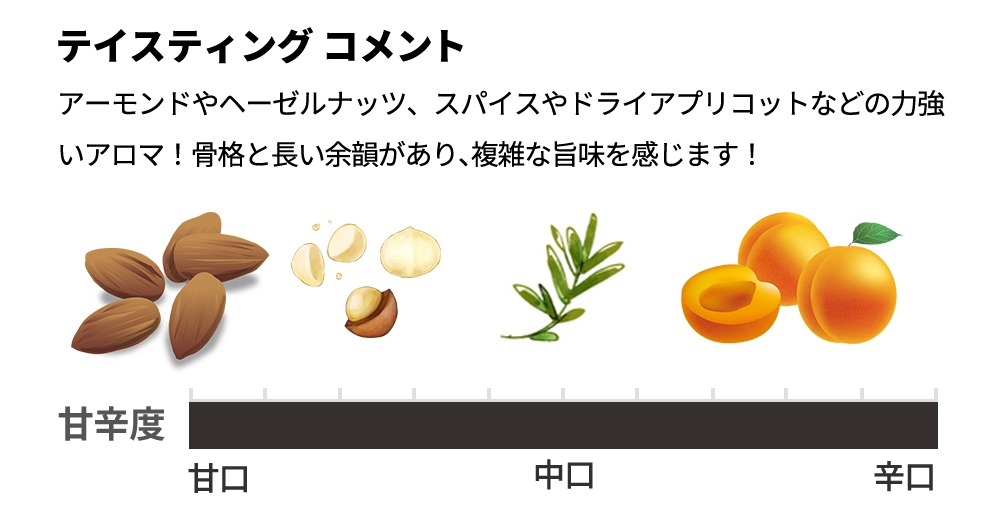 アーモンドやヘーゼルナッツ、スパイスやドライアプリコットなどの力強いアロマ!骨格と長い余韻があり、複雑な旨味を感じます!