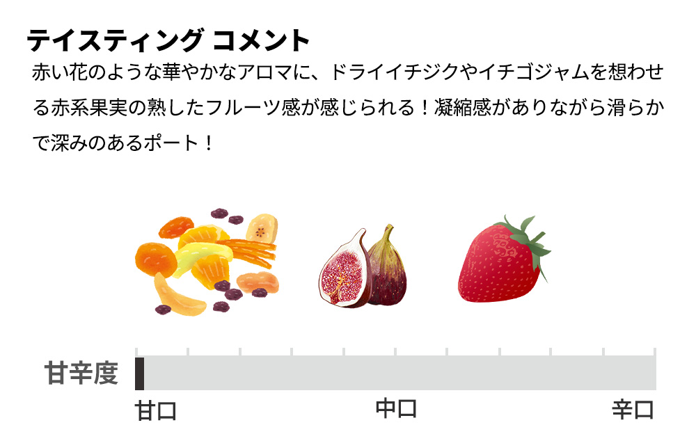 深いルビー色!赤い花のような華やかなアロマに、ドライイチジクやイチゴジャムを想わせる赤系果実の熟したフルーツ感が感じられる!凝縮感がありながら滑らかで深みのあるポート!