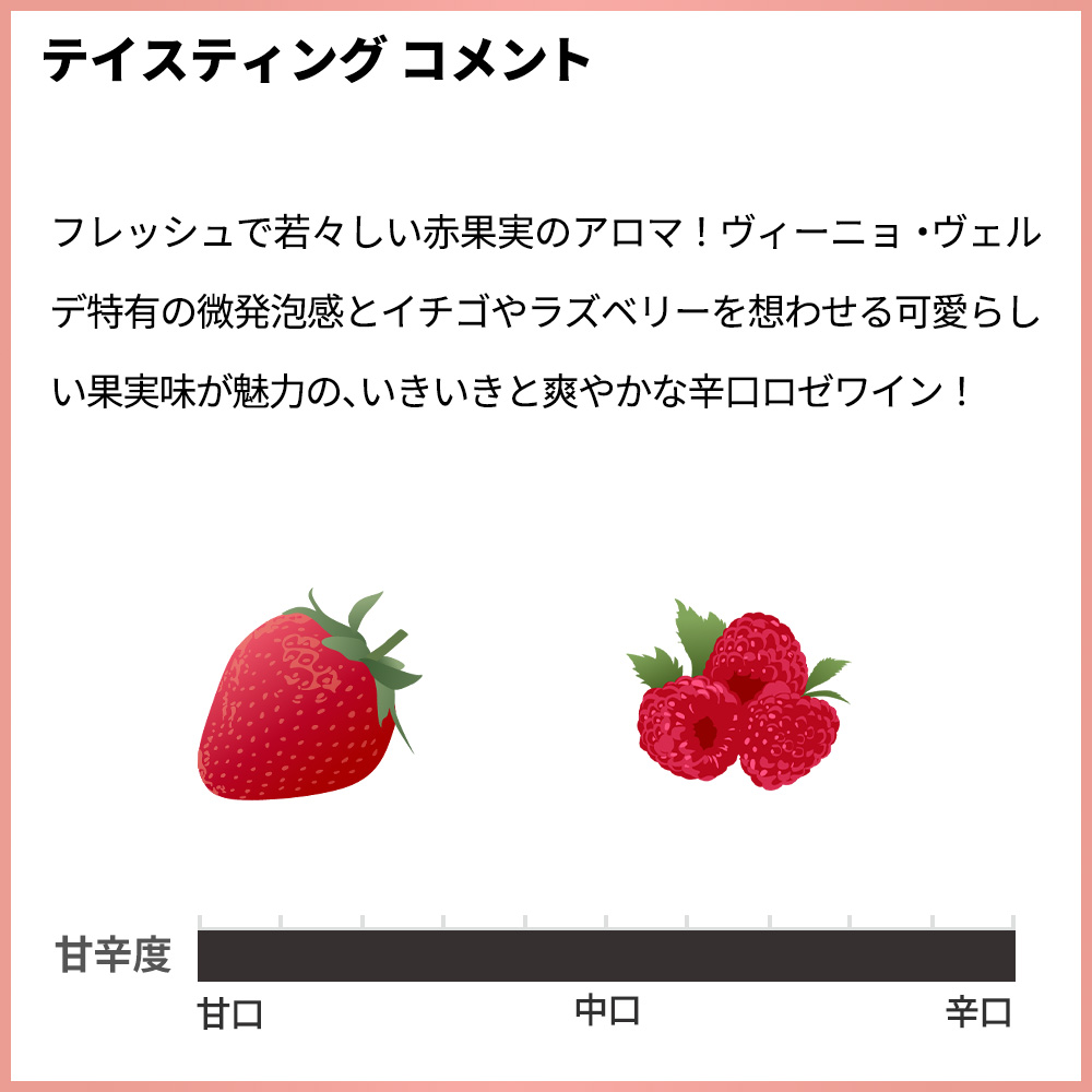 フレッシュで若々しい赤果実のアロマ!ヴィーニョ・ヴェルデ特有の微発泡感とイチゴやラズベリーを想わせる可愛らしい果実味が魅力の、いきいきと爽やかな辛口ロゼワイン!