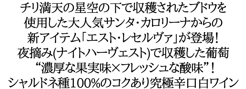 サンタ・カロリーナ“エスト・レセルヴァ”シャルドネ[2024]年 ぶどう品種:シャルドネ100% チリ満天の星空の下、夜摘み(ナイトハーヴェスト) 午後11時から午前6時の太陽が昇る前の時間帯に 収穫したブドウ100%使用! チリらしい豊かな果実味とフレッシュな酸味を楽しめる、 バランスが良く口当たりの良い味わいに仕上げられた “濃厚な果実味×フレッシュな酸味”の「エスト・レセルヴァ」! スペイン語で星を意味する「エストレージャ(Estrella)」に由来! 黒を背景に星のアイコンを配し、夜摘み中に見られる 満点の星空をイメージしたデザインに仕上げられたラベルも魅力的! シャルドネ100%で造られるこのワインは 熟した黄色い果実の香りと、程よい酸味のバランスが取れた 厚みのある味わいが魅力の極旨辛口白ワイン!