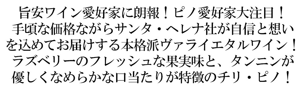 サンタ ヘレナ アルパカ ピノ ノワール 2024年 ■葡萄品種:ピノ・ノワール種100% 1942年創業のサンタ・ヘレナ社は、いち早く海外進出を果たしたチリワインにおける輸出ブランドのパイオニア! チリをはじめ南アメリカを代表する動物である“アルパカ”!手頃な価格ながらサンタ・ヘレナ社が自信と想いを込めてお届けする本格派ヴァライエタルワインのランク上のスペシャル・ブレンド! 定期的にワインを循環させ、色と味わいを抽出! 醸造が完了すると、果皮や種を取り除き熟成工程に入ります!その後、少しトーストした樽とトーストしていない樽に分けて熟成させ、その2つをブレンドすることによってよりボディ感を強める! ラズベリーのフレッシュな果実味と、タンニンが優しくなめらかな口当たりが特徴の極上辛口ミディアムボディ赤ワイン!