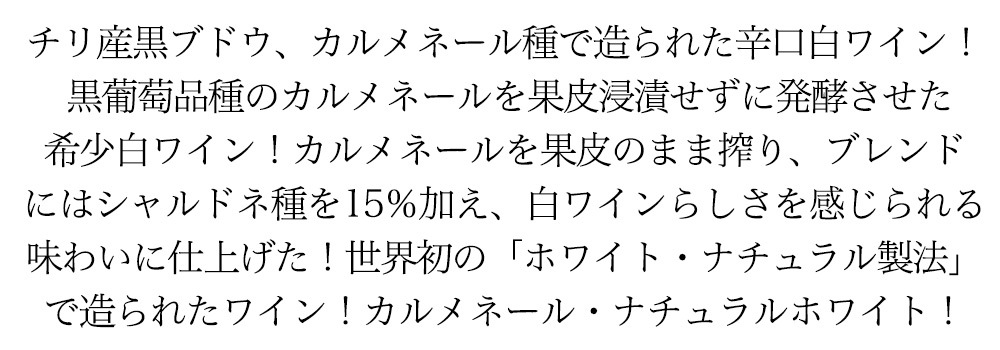 ナティバ カルメネール ナチュラルホワイト 2020 ■ぶどう品種:カルメネール(シャルドネ種を15%ブレンド) ■製法:ホワイト・ナチュラル製法 チリ産黒ブドウ、カルメネール種で造られた辛口白ワイン!黒ブドウ品種の「カルメネール」を果皮浸漬せずに発酵させた希少な白ワイン!カルメネールを果皮のまま搾り、ブレンドには「シャルドネ」種を15%加え、白ワインらしさを感じられる味わいに仕上げた!世界初の「ホワイト・ナチュラル製法」で造られたワイン! このナティバはカルメネールの特徴を最大限に引き出すことで、チリワイン特有の豊かな果実味を実感できる甘さを感じながらも、濃厚でスパイシーな味わいが心地よいアクセントとなって、口の中でいつまでもふくよかな余韻が広がります! 白ワインならではの爽やかさを感じながらも、黒ぶどうの果皮由来のナチュラルな色合い(ピンクを帯びたロゼの色合い)がスパイシーさとコク、余韻の奥行きをもたらします!おすすめの料理はキノコのマリネ、サバ缶カレー、焼きギョウザ他!
