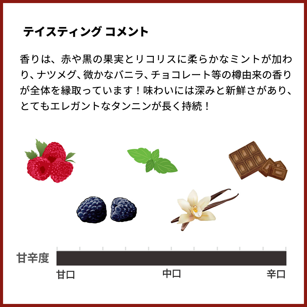 この複雑性に満ちたアコンカグア・キュヴェ・カベルネ・ソーヴィニヨン[2024]年は、紫の煌めきのある深いルビーレッドの色調を呈しています!香りは、赤や黒の果実とリコリスに柔らかなミントが加わり、ナツメグ、微かなバニラ、チョコレート等の樽由来の香りが全体を縁取っています!味わいには深みと新鮮さがあり、とてもエレガントなタンニンが長く持続!エラスリスが誇る中級レンジ“アコンカグア・キュヴェ”!アルコール度数13.5%の究極カベルネ・ソーヴィニヨン!大人気チリ究極フルボディ赤ワインが正規代理店輸入品で待望の少量入荷!