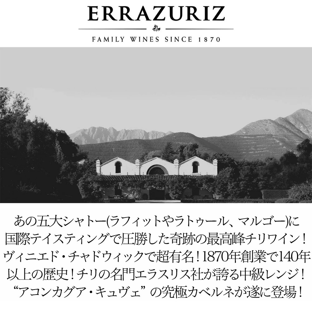高級チリ・フルボディ辛口赤ワイン愛好家大注目!世界のワイン愛好家大注目!名門エラスリスが誇る中級レンジ!“アコンカグア・キュヴェ”(エステート・シリーズのランク上)!あの五大シャトー(ラフィットやラトゥール、マルゴー)に国際テイスティングで圧勝した奇跡の最高峰チリワイン!偉大なヴィニエド・チャドウィックで超有名!1870年創業で140年以上の歴史を誇るチリの名門エラスリス社(チリの大統領を4人輩出してきた名家)!世界で最も優れたカベルネを生み出す“カベルネの聖地”チリの首都サンチャゴから北へ約100km、太平洋から約41km内陸に入ったアコンカグア・ヴァレーをほぼ独占所有!