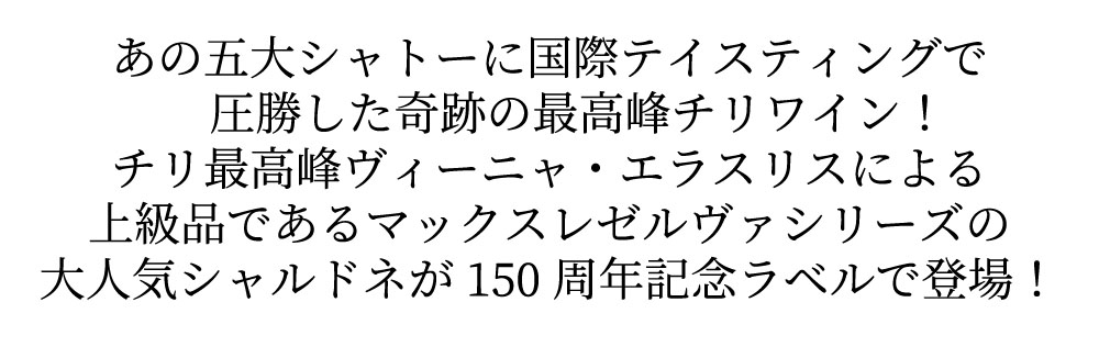 エラスリス・マックス・レゼルヴァ・シャルドネ[2021]年・エデュアルド・チャドウィック・チリ・アコンカグア・ヴァレー・アルコール度数13%・150周年記念ラベル ■ぶどう品種:シャルドネ100% 150周年記念ラベル! 現在6代目当主であるエドゥアルド・チャドウィック氏が最高醸造責任者フランシスコ・バエティッグ氏とともに造る、もはや伝説!チリ最高峰ヴィーニャ・エラスリスによるマックス・レゼルヴァ・シリーズの大人気シャルドネ! 主にアコンカグア・ヴァレーのマックス・ヴィンヤードのぶどうを使用!手摘み収穫されたシャルドネ100%は、ワイナリーに運ばれ全房プレス!マストは冷たいままステンレスのタンクにデキャンタージュすることで最大限の透明度を得る!その後フレンチオーク樽(新樽比率10%。残りは、1回又は2回使用した樽)へ移し発酵!約30%はマロラクティック発酵!その後非常に細かい澱の上でフレンチオーク樽で10ヶ月間熟成! きれいな酸味と鮮やかな香りが魅了のシャルドネです。熟したりんご、アプリコット、バニラの花の香りが、僅かなスパイスと濃厚なりんごと混じり合い、また溌刺とした酸味に彩られています。口に含むと優雅でありながらも印象深く、テロワールに独特の素晴らしい酸味、ストラクチャ、絶妙なバランスを感じさせる究極シャルドネ!