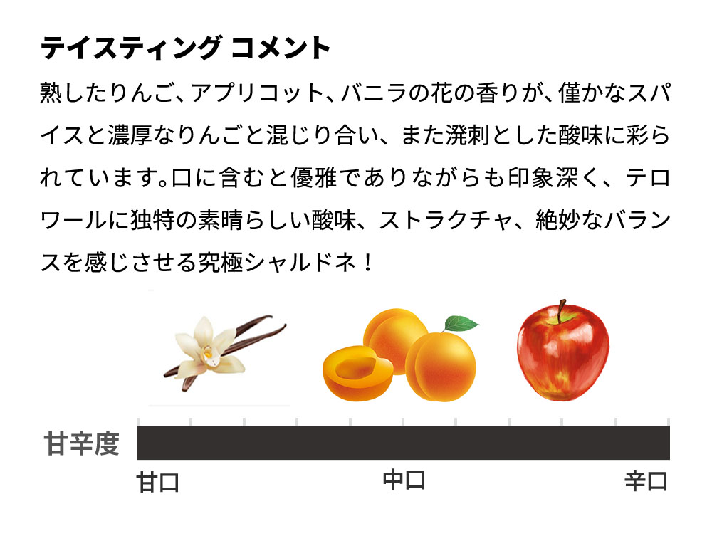 きれいな酸味と鮮やかな香りが魅了のシャルドネです。熟したりんご、アプリコット、バニラの花の香りが、僅かなスパイスと濃厚なりんごと混じり合い、また溌刺とした酸味に彩られています。口に含むと優雅でありながらも印象深く、テロワールに独特の素晴らしい酸味、ストラクチャ、絶妙なバランスを感じさせる究極シャルドネ!