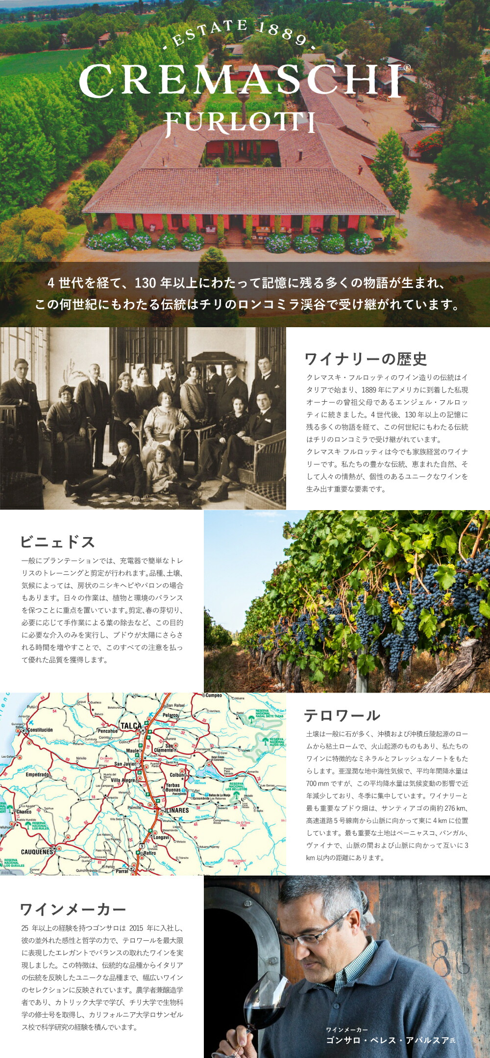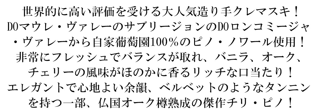 チリ産ミディアムボディ辛口赤ワイン愛好家大注目!チリ産自社畑100%ピノ・ノワール100%のミディアムボディ辛口赤ワイン愛好家大注目!チリ最大のワイン産地であり、古くからの産地として名高くチリの首都サンチャゴから南東へ45km行ったアンデス山脈のふもとのマイポ・ヴァレーのさらに南、DOマウレ・ヴァレー(Valle del Maule)のサブリージョンのDO Valle Del Loncomilla(DOロンコミージャ・ヴァレー)から自家葡萄園100%のピノ・ノワール種100%を手摘み100%で20%フレンチオークで6ヶ月熟成で造られるバランスの素晴らしい辛口赤ワイン!造り手は、名ワイン誌大注目!世界的ワインコンクールでも多数受賞!世界的に高い評価を受ける造り手!ワイン評論家のヒュージョンソン氏も「ポケットワインブック」で星付で注目する人気造り手クレマスキ・フルロッティ社!による鮮やかなルビーレッド!プラム、ブラックチェリーの香り!非常にフレッシュでバランスが取れ、バニラ、オーク、チェリーの風味がほのかに香るリッチな口当たり!エレガントで心地よい余韻、ベルベットのようなタンニンを持つミディアムボディ辛口赤ワインが、インポーターさんとの協賛プライス!で限定少量入荷!