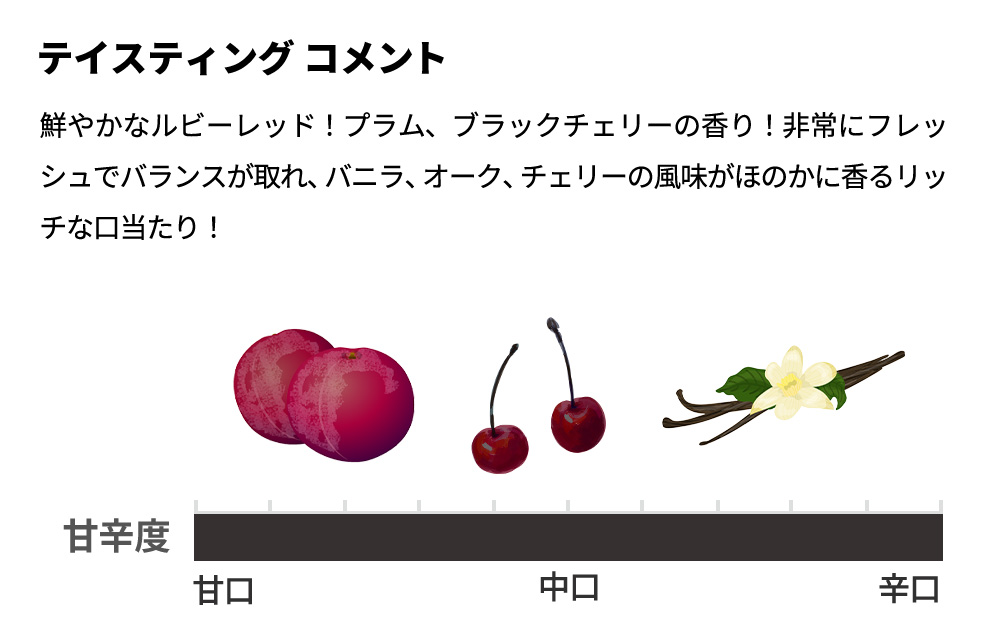 鮮やかなルビーレッド!プラム、ブラックチェリーの香り!非常にフレッシュでバランスが取れ、バニラ、オーク、チェリーの風味がほのかに香るリッチな口当たり!
