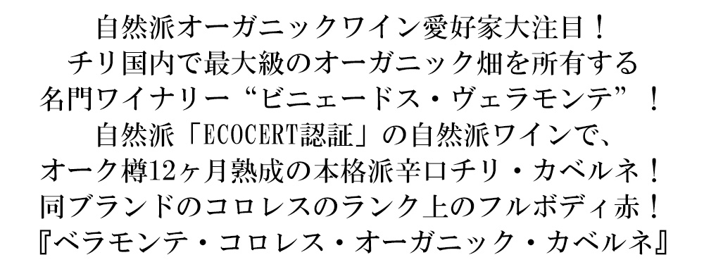 ビニェードス・ベラモンテからランク上の自然派ビオロジック(エコセール認証)のハイコスパ辛口赤ワイン!チリ国内で最大級のオーガニック畑を所有する名門ワイナリー!